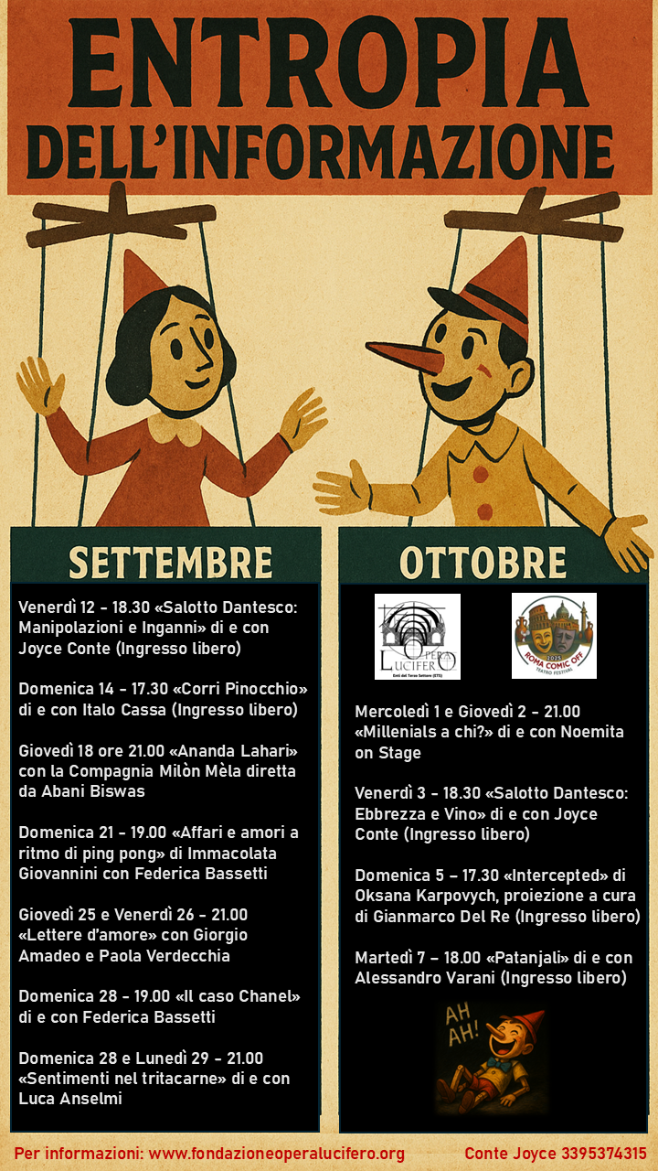 La Fondazione Opera Lucifero ETS, in occasione della Mostra “Entropia dell’informazione” a cura del Presidente Roberto Lucifero, promuove un’interessante rassegna culturale sulle manipolazioni mediatiche attuate nel campo della comunicazione: tra giochi d’astuzia, inganni e fake news proponiamo un ampio programma di eventi teatrali, letterari e antropologici pronti a stupirvi e farvi riflettere sulla nostra società, così facilmente influenzabile e così drammaticamente disinformata.