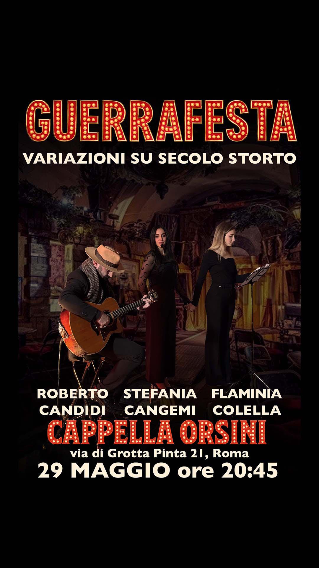 Con alla voce la scrittrice Flaminia Colella, autrice dei testi che verranno recitati, e l’attrice Stefania Cangemi, accompagnate dalla chitarra di Roberto Candidi “GUERRA FESTA, VARIAZIONI SU SECOLO STORTO” si presenta come una ballata in cui un medley di liriche dai toni onirici e surrealisti disegnano una conversazione immaginaria tra un personaggio ignoto (lo “straniero”) e la città di Roma; a questo loro fraseggio si aggiungono le visioni di alcuni personaggi, che, come in un canone che si avvolge su sé stesso, concorrono a definire la temperatura di una singolare interrogazione ad una delle città più antiche della terra.